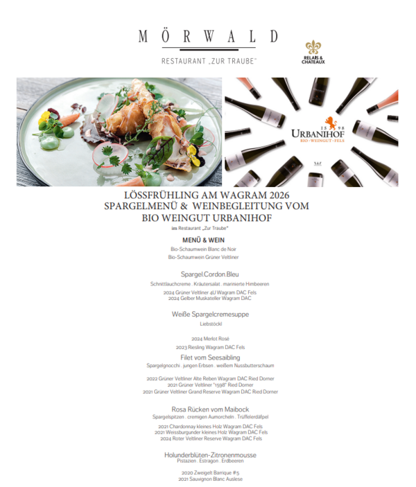 5-gängiges Spargel-Gourmetmenü mit begleitender Bio-Weinbegleitung vom Bio Weingut Urbanihof im Restaurant „Zur Traube“.