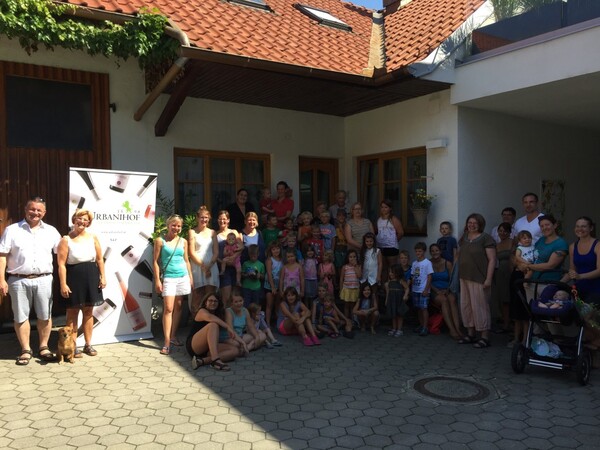 Am 3.8.2017 war unser Hof von Kinderlachen erfüllt. 32 Kinder waren im Rahmen des Kinder Sommers Wagram im Urbanihof zu Besuch und haben sich gemeinsam mit Franz und Sonja Paschinger auf die Spuren des Traubensafts begeben. Die Kinder haben ihr persönliches Traubensaft Etikett entworfen und durften dann ihre ganz eigene Flasche mit nach Hause nehmen. Eine Tour durch den kühlen Weinkeller hat für eine willkommene Abwechslung gesorgt und ganz nebenbei haben die Kleinen auch noch viel über ihr (neues) Lieblingsgetränk erfahren.